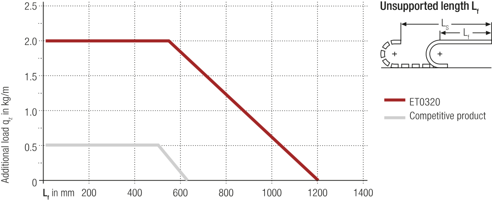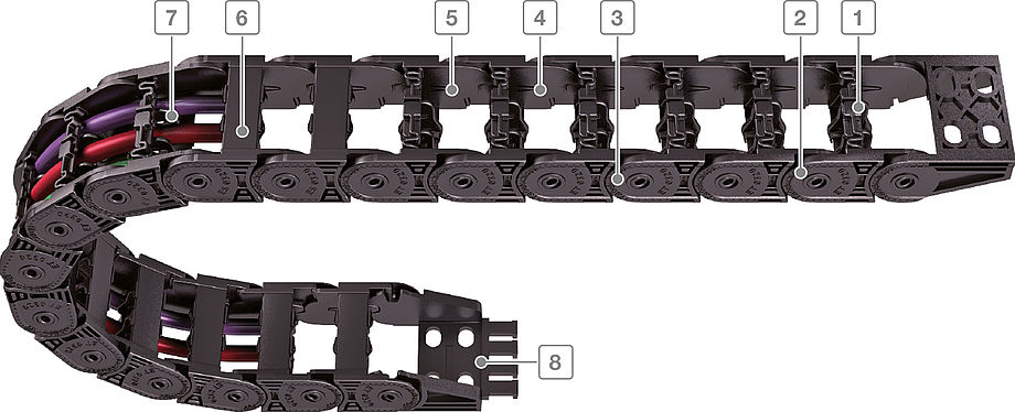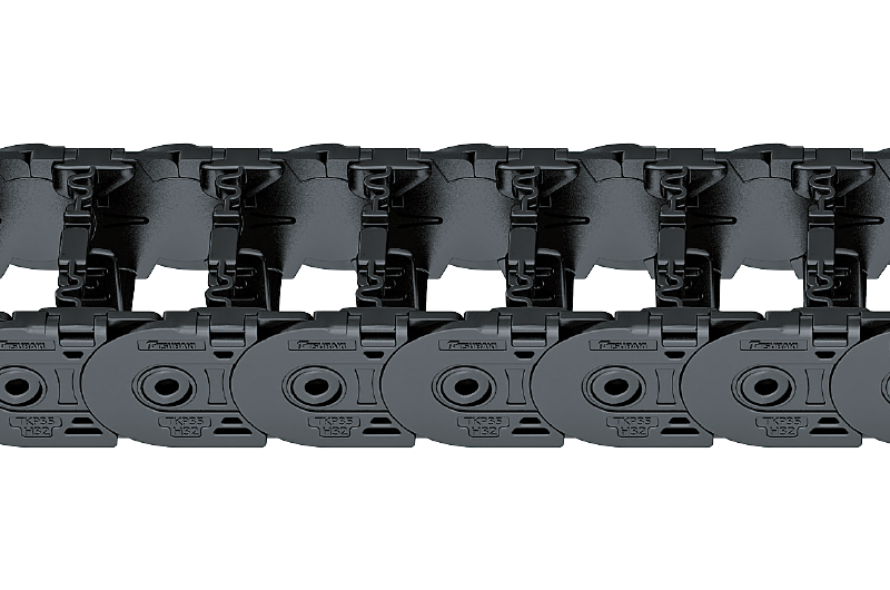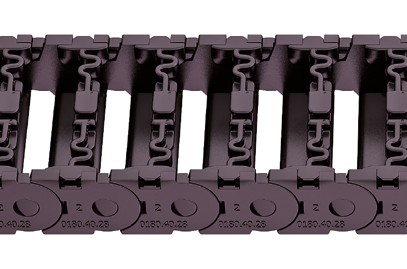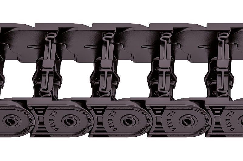 Cable carriers need to be extremely sturdy, with extensive unsupported length. At the same time, cables need to be inserted easily for fast cable laying. The EasyTrax® meets these requirements thanks to its innovative design and material combination of a hard cable carrier body made from fiber glass reinforced material and lamellae made of elastic plastic.