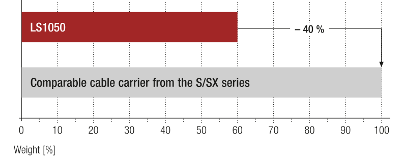 The weight-optimized link plate design makes the cable carriers very light yet highly sturdy. For the LS series, the unsupported length is significantly higher compared to plastic cable carriers of a similar size.