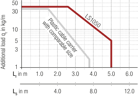 The weight-optimized link plate design makes the cable carriers very light yet highly sturdy. For the LS series, the unsupported length is significantly higher compared to plastic cable carriers of a similar size.