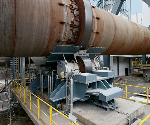 The rotary kiln is the core of lime and cement clinker production. In the slightly inclined cylindrical tube, which rotates around its longitudinal axis during the firing process, the lime powder is heated up to 1450 °C and burned into cement clinker. The rotation has both a transport and an air injection effect. The length of such a kiln can be well over 100 meters. In this type of kiln, the limestone is added at the slightly higher end and slowly passes through the kiln due to the rotation. All drive elements must also be inclined accordingly. FLENDER offers the latest drive systems for rotary kilns.