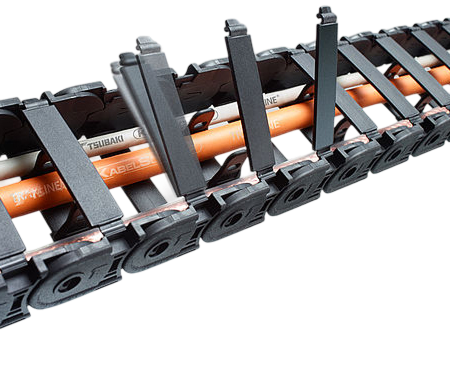 The QT0320 meets these requirements thanks to its innovative design and material combination of a hard cable carrier body made from glass fiber-reinforced material and crossbars with a film hinge made from rigid special plastic.
