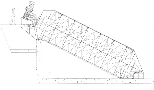 The classic and most common form is the arrangement of the screw pump in an open concrete trough where the screw, suspended between the upper- and lower bearing, rotates free from the trough with a minimal gap of only a few millimetres.