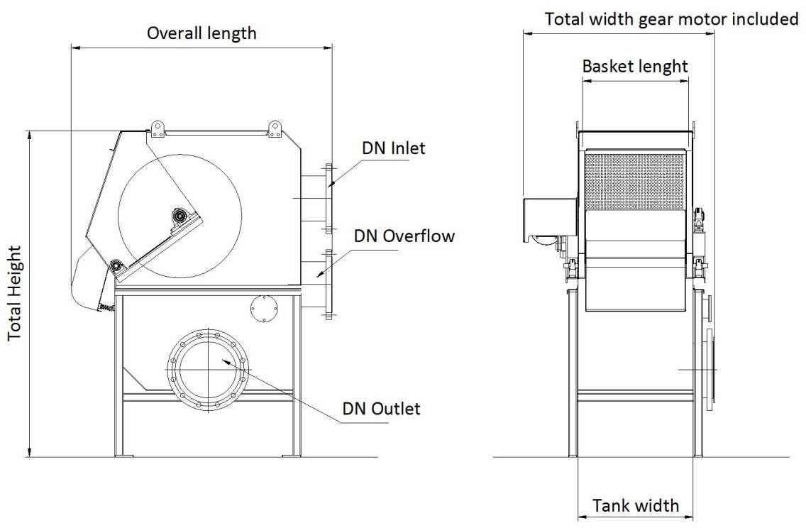 The slurry to be treated, entering the tank through the entrance and are distributed over the entire length of the drum. The slow rotation of the drum separates the material in suspension in the water and is transported in front of the machine and discharged by a scraper.