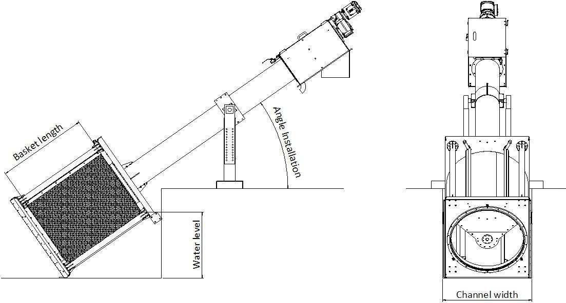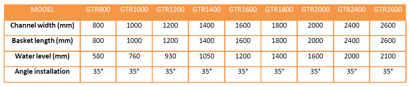 The machine can be installed inclined (between 35 ° and 45 ° depending on the needs) into a concrete channel or in a stainless steel tank to receive the waste waters from a fix pipe; this version is called GTR-T – ROTARY DRUM SCREEEN IN TANK.