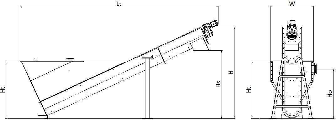 It consists in a suitably shaped decantation hopper, with a screw for the sedimented materials extraction. The spiral is normally of the type without central shaft (shaftless), but is also provided for the version with central shaft (shafted).