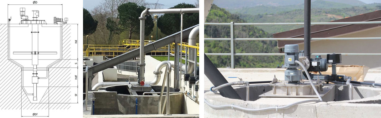 Once the gear motor is activated, the shovels create a vortex inside the tank full of effluent. This vortex facilitates the sedimentation on the bottom of the tank of the sands, also of particle extremely small (up to 100 microns).